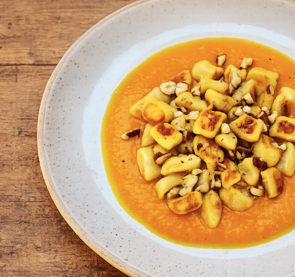 Gnocchi maison, crème de potimarron et parmesan, éclats de noisettes